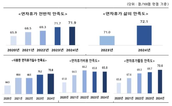 연차 소진율은 79.4%로 전년 대비 1.6%포인트 증가해 근로자 휴가조사를 시작한 2018년 이래 최고치를 나타냈다. 연차 사용 목적으로는 여행이 35%로 2022년 이후 가장 높은 비율을 유지하고 있으며, 그다음으로 휴식 28.6%, 집안일 16.0% 등의 순으로 나타났다.