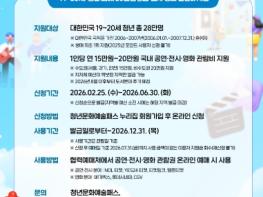 문화체육관광부와 한국문화예술위원회가 주관하는 2026년도 청년문화예술패스는 19~20세(2006~2007년생) 청년을 대상으로 1인당 20만 원을 지원한다. 이는 지난해 19세 대상 15만 원 지원에서 지원 대상과 지원금이 확대된 것이다.