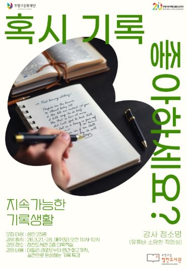 특히 참여자가 직접 자신의 일상을 기록하고, 개인별 기록 습관을 설계해 보는 실습 중심 프로그램으로 운영해 기록의 의미와 즐거움을 체감하는 시간이 될 것으로 기대된다.