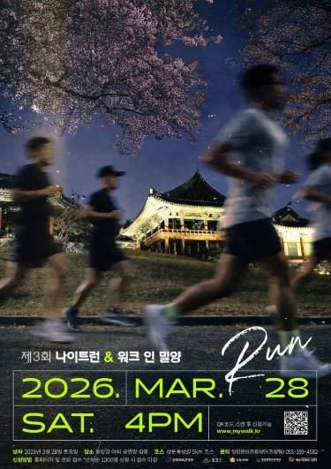 [한식일보] 밀양문화관광재단은 오는 3월 28일 삼문동 밀양강 둔치 일원에서 벚꽃 철을 맞아 지역 야간관광 활성화를 위한 이색 러닝 축제 ‘제3회 나이트 런 앤 워크 인 밀양(Night Run & Walk in Miryang)’을 열고, 3월 22일까지 참가자를 모집한다.