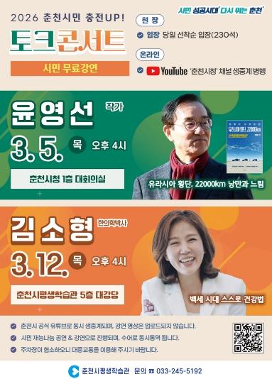 강연에 앞서 5일에는 ‘동면색소폰동호회’, 12일에는 ‘춘천실버오케스트라’의 재능나눔 공연이 펼쳐져 시민이 쌓아온 평생학습 성과를 함께 나누는 시간도 마련된다.