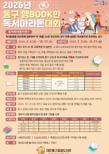 [한식일보] 대전 동구는 구민의 독서문화 확산을 위해 오는 10월 31일까지 ‘2026년 동구 행BOOK한 독서마라톤대회’를 개최한다고 4일 밝혔다.