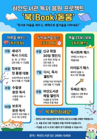김광용 하안도서관장은 “이번 북돋움 프로젝트는 단발성 행사가 아닌 연중 지속적인 운영으로 시민들이 독서 응원을 받고 일상 속에 도서관이 스며드는 계기가 될 것”이라며 “많은 시민이 자연스럽게 도서관을 찾고 마음의 위로를 얻으며 독서의 가치를 재발견하길 바란다”고 말했다.
