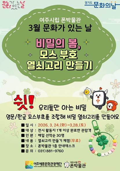 [한식일보] 여주세종문화관광재단이 운영하는 여주시립 폰박물관은 3월 '문화가 있는 날'을 맞아 오는 24일부터 28일까지 5일간 시민 참여형 행사 ‘비밀의 봄, 모스부호 열쇠고리 만들기’를 운영한다.