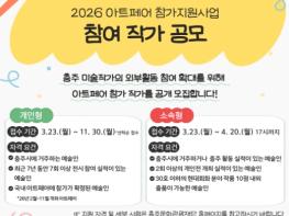 (재)충주문화관광재단은 3월 23일부터 ‘2026 아트페어 참가 지원사업 참여 작가’ 공모를 진행하고 있다고 밝혔다.