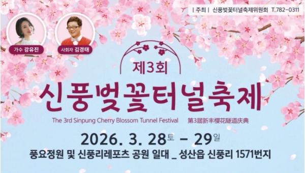 [한식일보] 서귀포시는 몸과 마음이 가벼워지는 따스한 봄, 가족・연인・친구 간의 잊지 못할 추억을 선사할 제3회 신풍벚꽃터널축제가 28일~29일 양일간 성산읍 풍요정원 및 신풍리레포츠 공원 일원에서 개최된다고 밝혔다.