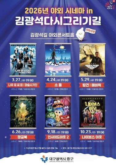 [한식일보] 대구 중구는 오는 3월 27일부터 김광석길 야외콘서트홀에서 2026년 ‘야외 시네마 in 김광석다시그리기길’을 운영한다.