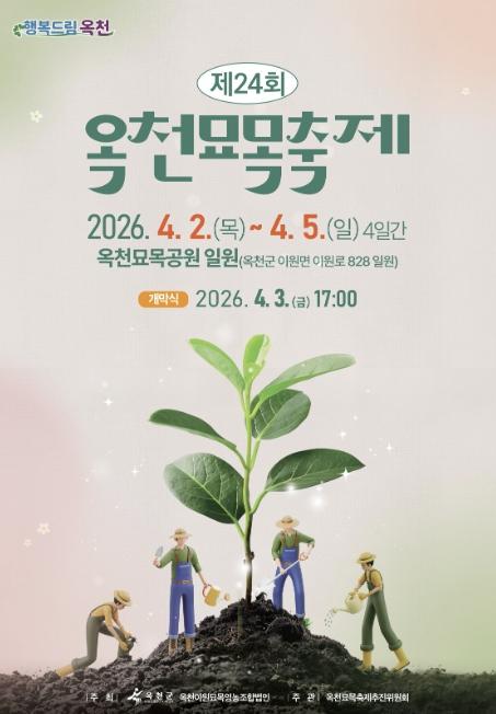 제24회 옥천묘목축제는 국내 최대 규모의 묘목 생산·유통단지인 옥천군에서 열리는 대표 축제로, 행사 기간 동안 ▲2만 그루 묘목 나누어주기 ▲‘명품 묘목을 찾아라’ ▲명품묘목 상담관 ▲우리가족 소망묘목 심기 ▲신비아파트 어린이 뮤지컬 ▲스탬프 투어 ▲각종 체험 프로그램 등을 운영해 방문객들에게 다채로운 즐길 거리를 제공할 계획이다.