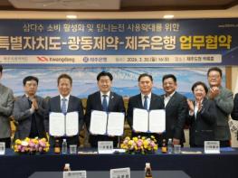 제주도는 30일 도청 백록홀에서 삼다수 유통 협력사 광동제약, 탐나는전 운영대행사 제주은행과 함께 ‘삼다수 소비 활성화와 탐나는전 사용 확대’를 위한 업무협약을 체결했다.