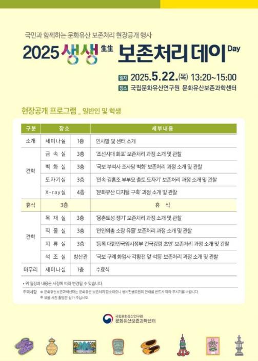 [한식일보] 국가유산청 국립문화유산연구원 문화유산보존과학센터는 오는 5월 21일과 22일 이틀간 문화유산보존과학센터(대전 유성구)에서 문화유산 보존처리 과정을 일반인과 청소년에게 공개하는 ‘생생生生보존처리 데이Day’를 운영한다.