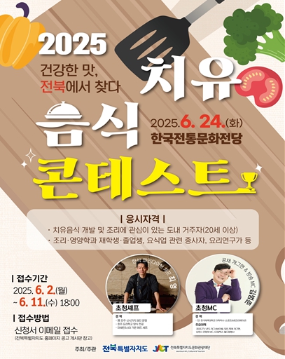 [한식일보] 전북특별자치도는 도민의 건강한 식생활 문화 확산과 웰니스 관광 활성화를 위한 ‘2025 전북 치유음식 콘테스트’를 오는 6월 24일, 한국전통문화전당에서 개최한다고 밝혔다.
