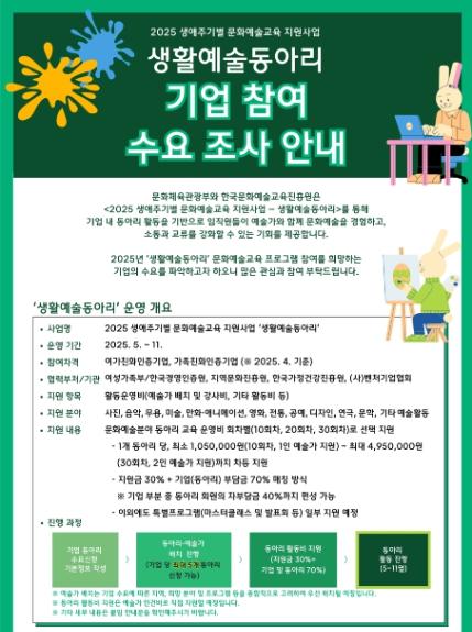 [한식일보] 문화체육관광부는 한국문화예술교육진흥원과 함께 일상에서 예술 활동을 즐길 수 있도록 기업 내 문화예술 동아리에 예술교육 비용 일부를 지원하는 생활예술동아리 활성화 시범사업을 추진한다. 시범사업에 참여하기를 원하는 기업은 4월 22일부터 30일까지 진흥원 누리집에서 진행하고 있는 수요조사에 참여하면 된다.