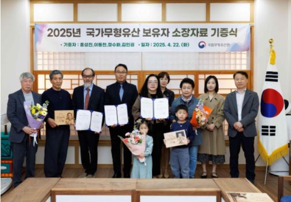 [한식일보] 국가유산청 국립무형유산원은 4월 22일 국립무형유산원(전북 전주시)에서 국가무형유산 관련 자료 기증자들을 초청해 '국가무형유산 소장자료 기증식'을 개최했다. 작년 한 해 동안 기증된 자료는 고(故) 홍점석 단청장 보유자, 고(故) 이철호 구례향제줄풍류 보유자, 고(故) 심부길 나전장 보유자, 고(故) 김수악 진주검무 보유자의 소장자료 등 총 459건(1,004점)이다.