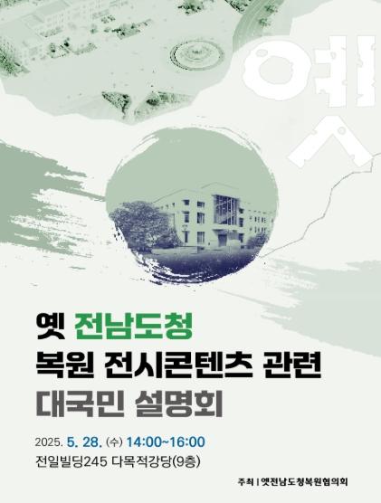 [한식일보] 문화체육관광부 옛전남도청복원추진단과 광주광역시, 옛전남도청복원범시도민대책위로 구성된 옛전남도청복원협의회는 5월 28일 오후 2시, 전일빌딩245(9층 다목적강당)에서 ‘옛 전남도청 복원 전시콘텐츠 관련 대국민 설명회’를 개최한다.