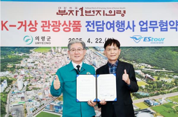 [한식일보] 의령군은 지난 22일 ㈜부산은성관광(대표 장영둘)과 손잡고 K-거상 관광루트 활성화를 위한 업무협약을 체결했다고 밝혔다.