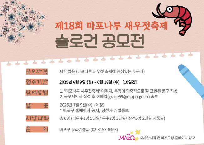 이번 공모는 지역 주민의 자발적인 참여와 관심을 이끌어내고, 마포의 대표 축제인 ‘새우젓축제’에 애정과 기대감을 자연스럽게 높이기 위해 마련됐다.