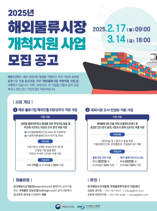 [한식일보] 해양수산부는 2월 17일부터 3월 14일까지 '2025 해외물류시장 개척지원 사업'지원대상기업을 모집한다고 밝혔다.