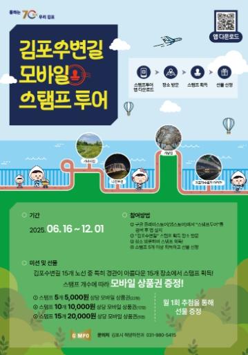 이번 스탬프 투어는 모바일을 활용한 온라인 투어 방식으로, 참가자는 스마트폰에서 ‘스탬프 투어’ 앱을 다운받아 김포수변길 15개 코스에서 지정 장소에 방문하면 위치정보(GPS)를 통해 자동으로 스탬프를 수집하게 된다. 스탬프를 일정 개수 이상 모으면 기념품도 받을 수 있다.