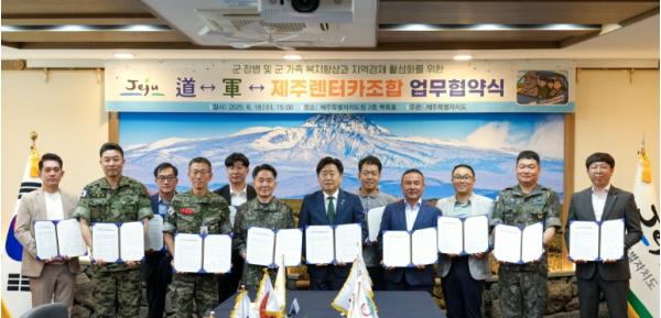 제주특별자치도는 18일 오후 3시 도청 백록홀에서 제주 주둔 주요 군부대와 제주도렌터카조합 간 ‘군 장병 및 가족 복지 향상과 지역경제 활성화를 위한 업무협약’을 체결했다.