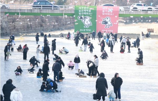 첫 축제로 마련된 이번 행사는 마을 앞 하천에 자라던 풀 ‘여뀌’를 주민들이 정겹게 불러온 이름 ‘여꾸섬’을 무대로, 자연 빙판을 활용한 썰매 체험이 입소문을 타며 여꾸섬은 아이들과 가족들로 가득 찼다.