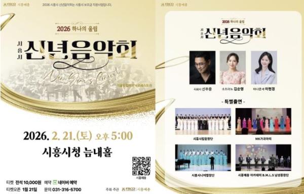 • [한식일보] 시흥시가 지원하고 (사)한국예술문화단체총연합회 시흥지회에서 주관하는 ‘2026 시흥시 신년음악회- 하나의 울림’이 오는 2월 21일 오후 5시, 시청 늠내홀에서 개최된다.