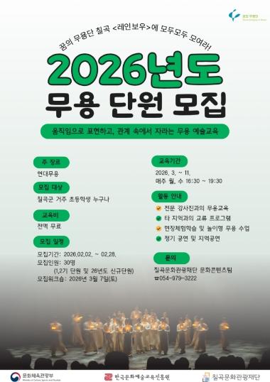 (재)칠곡문화관광재단(이사장 김재욱)은 2025 꿈의 무용단, ‘칠곡’ '레인보우' 단원을 모집한다.