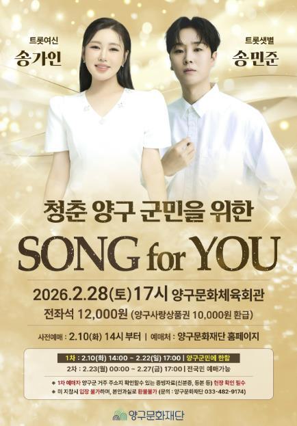[한식일보] 양구문화재단은 다가오는 봄을 맞아 양구군민의 문화 향유 기회를 확대하고 지역에 활력을 불어넣기 위해 2월 기획 콘서트 ‘SONG FOR YOU’양구군민 콘서트를 개최한다.