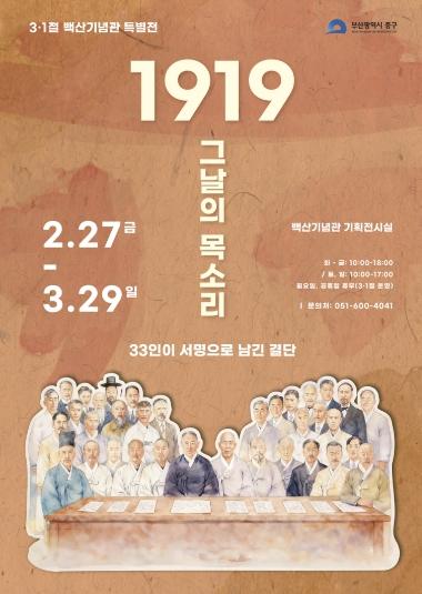 • [한식일보] 부산 중구는 제107주년 3·1절을 맞아 오는 2월 27일부터 3월 29일까지 백산기념관 기획전시실에서 '1919 그날의 목소리, 33인이 서명으로 남긴 결단'특별전을 개최한다.