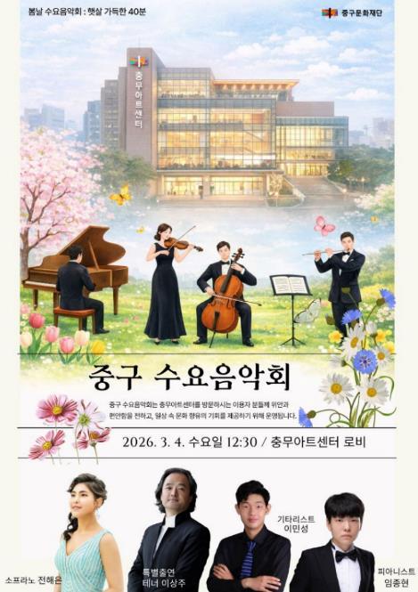 • [한식일보] 평범한 일상 속 점심시간, 음악과 함께하는 특별한 시간이 펼쳐진다. 중구문화재단은 오는 3월 4일 낮 12시 30분, 충무아트센터 1층 로비 공간에서 ‘중구 수요음악회’의 첫 공연을 개최한다.