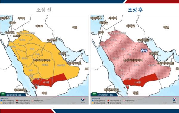 - 사우디아라비아: 2단계(여행자제) → 특별여행주의보 / 3단계(출국권고) → 3단계(출국권고)