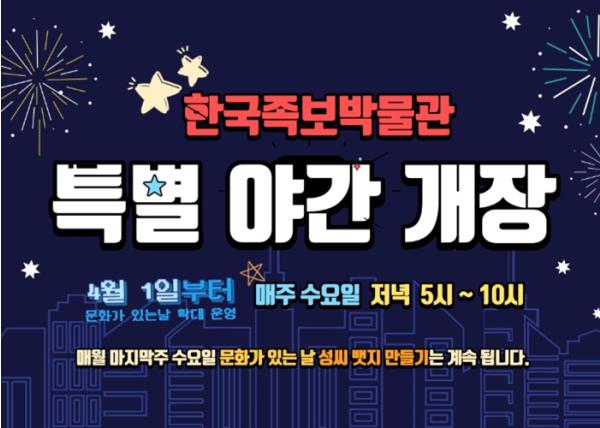 • [한식일보] 대전 중구 한국족보박물관에서는 오는 4월 1일부터 문화체육관광부가 지정한 ‘문화가 있는 날’정책이 매달 마지막 주 수요일에서 ‘매주 수요일’로 확대됨에 따라, 관람객들이 보다 편리하게 박물관을 이용할 수 있도록 매주 수요일 밤 10시까지 특별 야간 개장을 실시한다고 밝혔다.