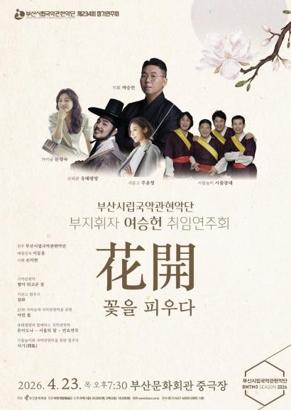 (재)부산문화회관(대표이사 차재근)은 오는 4월 23일 오후 7시 30분, 부산문화회관 중극장에서 부산시립국악관현악단 제234회 정기연주회이자 여승헌 부지휘자의 취임연주회 〈화개(花開) - 꽃을 피우다〉를 개최한다.