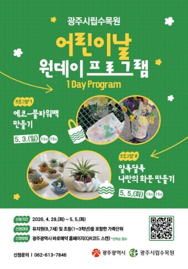 • [한식일보] 광주광역시 시립수목원은 어린이 가족이 함께 하는 ‘수목원 어린이날 원데이 프로그램’ 참가자를 오는 28일부터 선착순 모집한다.
