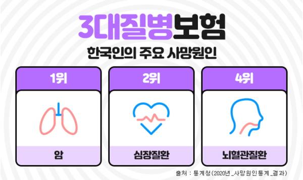 [한식일보] 한국인의 주요 사망원인중에 암, 뇌혈관질환, 심혈관질환은 흔히 3대질병이라 일컬어지며 살아가면서 가장 먼저 대비해야 하는 중대질병으로 항상 강조되고 있다. 이들 질병에 미리 대비하기 위해 가입하는 것이 진단비보험인데, 이러한 3대질병진단비를 중점으로 보장하는 보장성보험이 3대진단비보험 이다. 3대질병진단비보험은 각각의 질병에 주목해서 보장하기도 하지만, 나에게 맞는 추가 특약을 잘 골라서 가입한다면 종합건강보험으로도 충분히 활용도가 높다.