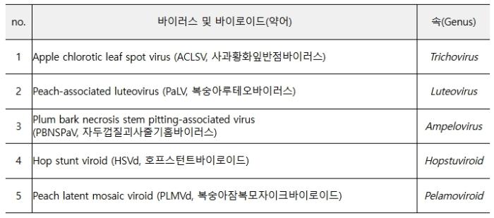 복숭아 나무가 바이러스에 감염되면 생육 불량과 기형과 발생으로 과실의 품질이 저하되어 극심한 피해를 유발한다. 이를 극복하려면 바이러스에 감염되지 않은 건전한 무병묘를 사용해야 하는데, 이때 감염여부를 신속하게 진단하는 기술이 반드시 필요하다.