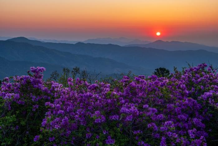 • 진분홍 철쭉과 호랑이 등줄기 같은 장엄함 백운산 능선 위로 떠오르는 일출 장관