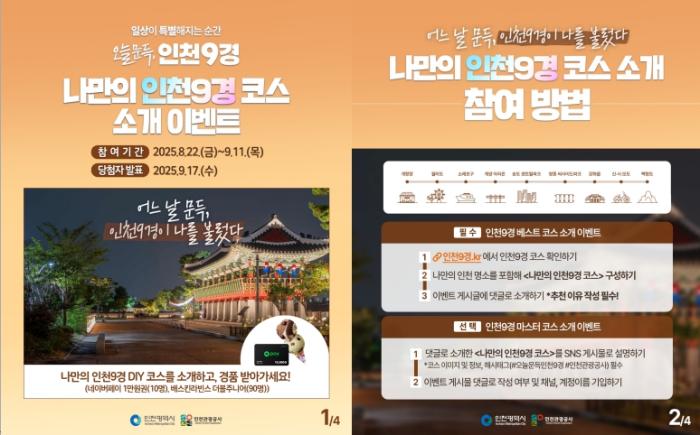 • [한식일보] 인천광역시와 인천관광공사(사장 백현)는‘2025 인천9경 통합 홍보 캠페인’의 일환으로 오는 8월 22일부터 9월 11일까지 '3차 온라인 이벤트'를 진행한다. 이번 이벤트는 시민과 관광객이 직접 자신만의 인천9경 코스를 구성하고 추천 이유를 공유하며, 온라인 참여 확산과 신규 코스 발굴을 목표로 한다.