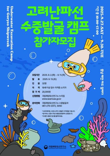 [한식일보] 국가유산청 국립해양유산연구소는 오는 9월 27일부터 30일까지 일반 국민들이 수중유산 조사를 직접 체험해볼 수 있는 '고려난파선 수중발굴 캠프'를 운영한다. 지금까지는 수중발굴 전문가들만 경험해 볼 수 있었던 신비롭고도 역사적인 바다가 이제는 국민에게 활짝 열리는 것이다.