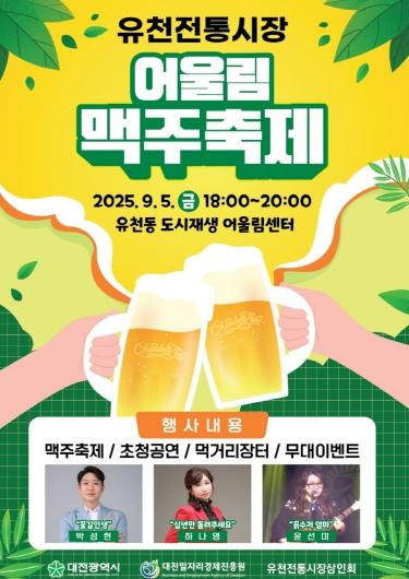 한편, ‘어울림 맥주축제’는 오는 9월 5일 오후 4시 상인회 사무실 개소식을 시작으로 오후 5시 30분부터 본격적인 축제가 열릴 예정이다. 자세한 내용과 참여 방법은 유천전통시장 상인회를 통해 안내받을 수 있다.