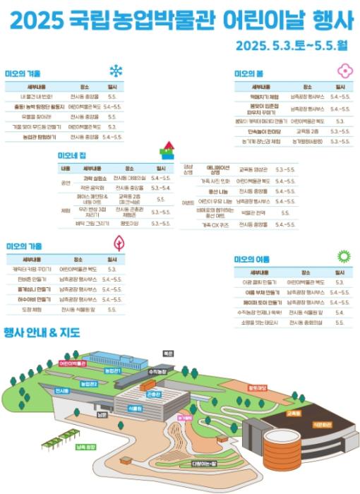 ‘가정의 달 5월’을 맞아 국립농업박물관에서는 5월 3일부터 5월 5일까지 “꼬마농부 미오네 집으로 놀러와!”라는 어린이날 행사*가 개최된다. 이번 행사에서는 박물관 전역을 활용하여 어린이와 부모님들이 농촌의 사계절(24절기)을 체험할 수 있도록 계절별로 다양한 프로그램을 제공할 예정이다.