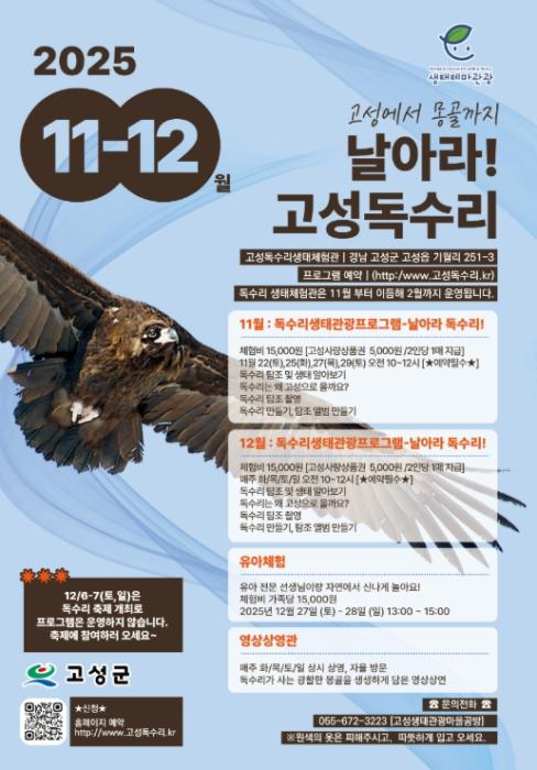 독수리 생태체험 프로그램 내년 2월까지 매주 화요일, 목요일, 토요일 오전 10시부터 12시까지 운영되며, 고성 독수리 누리집을 통해 사전예약 후 참여할 수 있다.
