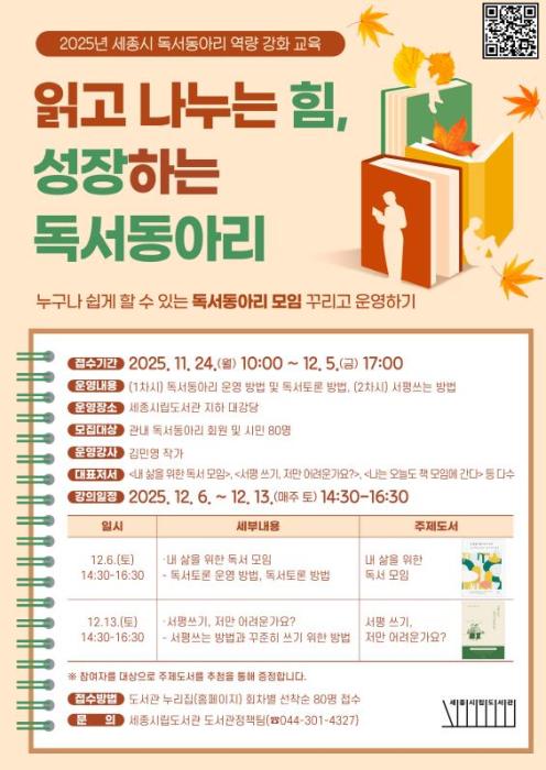 • [한식일보] 세종시립도서관이 내달 6일부터 13일 매주 토요일마다 시립도서관 대강당에서 시민 독서공동체 활성화를 위해 독서동아리 역량 강화 교육을 실시한다.