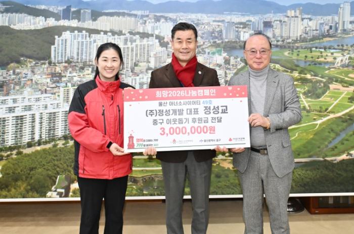• ㈜정성개발(대표이사 정성교)이 12월 5일 오후 3시 30분 중구청 구청장실을 방문해 울산사회복지공동모금회를 통해 이웃돕기 후원금 300만 원을 전달했다.