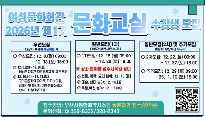 [한식일보] 부산시 여성문화회관은 오는 내일(8일)부터 '2026년 제1기 문화교실' 수강생을 모집한다고 밝혔다.
