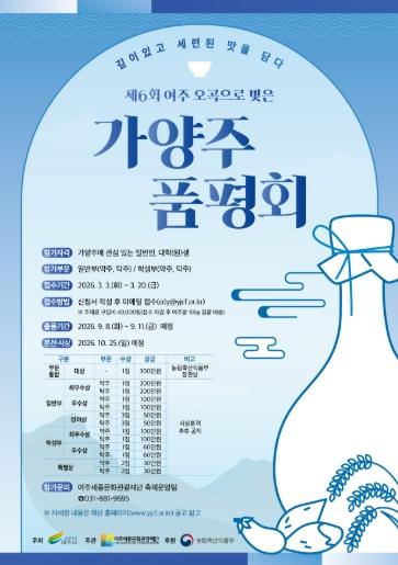 여주세종문화관광재단(이사장 이순열)이 오는 3월 3일부터 3월 20일까지 ‘제6회 여주 오곡으로 빚은 가양주 품평회’ 참가자를 모집한다.