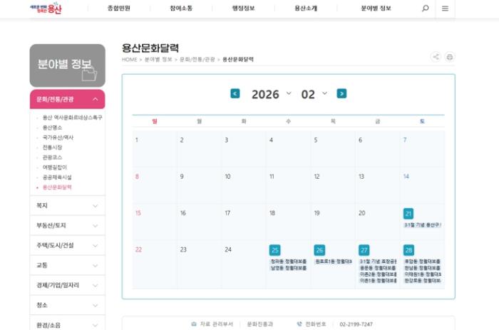 • [한식일보] 서울 용산구는 용산구와 용산문화원, 용산역사박물관 등 유관 기관이 운영하는 다양한 문화행사 정보를 한눈에 확인할 수 있는 온라인 기반 ‘용산문화달력’을 구축하고, 2월부터 정식 운영한다고 밝혔다.