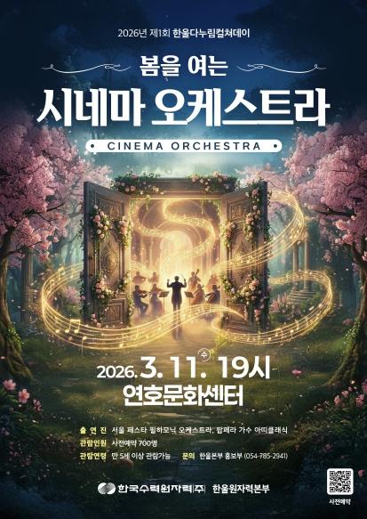 • 한국수력원자력(주) 한울원자력본부는 3월 11일 19시 울진군 연호문화센터에서 제1회 한울다누림컬쳐데이 '봄을 여는 시네마 오케스트라'를 개최한다.