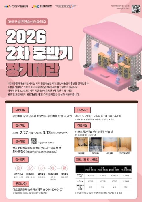 • 제주문화예술재단(이사장 김석윤)은 공연예술 장르 연습을 희망하는 예술가(단체)를 대상으로 『아르코공연연습센터@제주』 2026년 2차 중반기(5월~8월) 정기대관 공모를 2월 27일부터 3월 13일까지 진행한다.