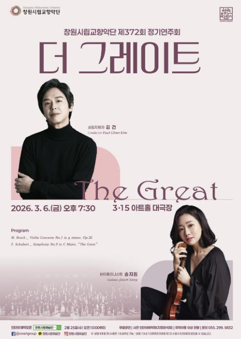 • [한식일보] 창원시립교향악단은 오는 2026년 3월 6일 오후 7시 30분, 창원 3.15아트홀 대극장에서 제372회 정기연주회 '더 그레이트(The Great)'를 개최한다.
