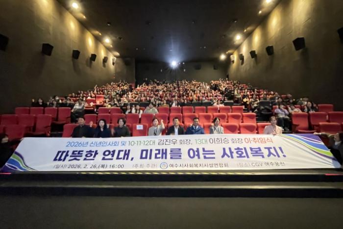 • 여수시사회복지시설연합회(회장 이희승)는 2026년 2월 26일, CGV 여수웅천점에서 '회장 이·취임식 및 신년교례회'를 개최하고, 회원들과 함께 영화관람 행사를 진행했다.